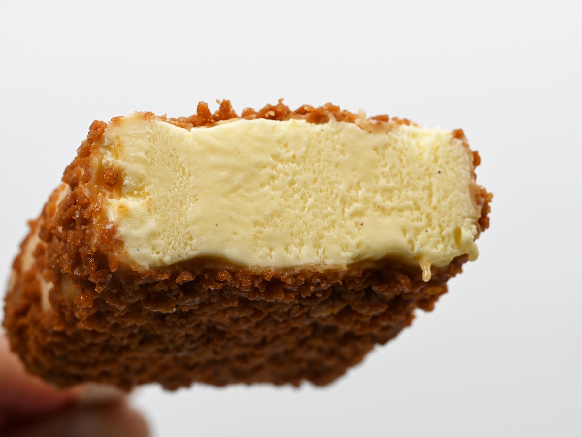クランチ粒の大きさもランダムで、大小さまざまなかけらが乱雑に貼りついています。この粒の大きさのバラつきが、後から効いてくる食感の奥行きに繋がっているのは、ブラックモンブランシリーズ共通のこだわり。クランチ越しにチラリと見えるアイス部分は、バニラとは違う、ほんのり黄みがかったクリーム色。カスタードっぽさが見た目でも伝わってきます。
