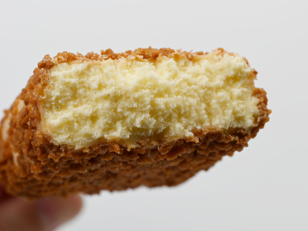 その奥に現れるのが、カスタード風味のアイス。卵黄のコクと、バニラビーンズの甘い香りがしっかり主張してきます。ただ、いわゆる「ガチの卵感」ではなく、ミルクと卵のバランスがきれいに取れた、やさしく上品なカスタード。ビアードパパのパイシュークリームをかじったときの、あのなめらかで贅沢なクリームの記憶が、そのまま冷凍庫経由で届いたような仕上がり。