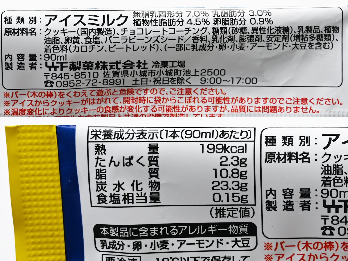 直近のブラックサンダーコラボとほぼ同格のサイズ感。大人が一本食べ切るのにちょうどいい塩梅。種類別はアイスミルクで、無脂乳固形分7.0%、乳脂肪分3.0%、植物性脂肪分4.5%、卵脂肪分0.9%。卵脂肪が明記されているあたり、カスタード味としての設計意図が数値にも表れています。