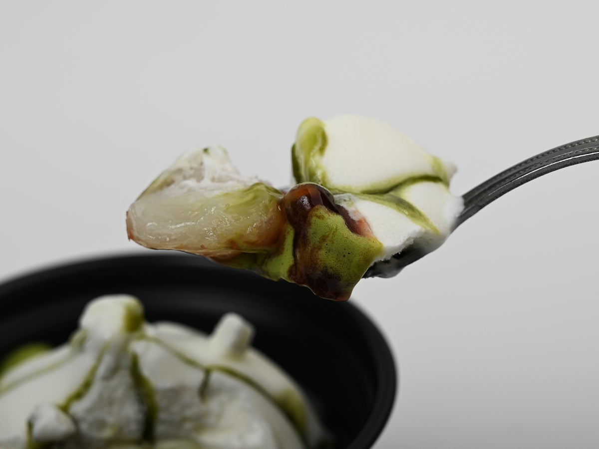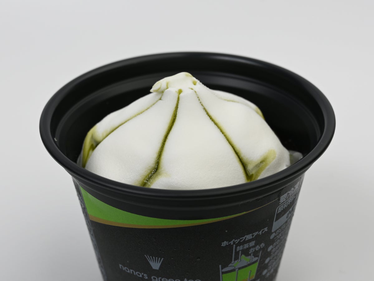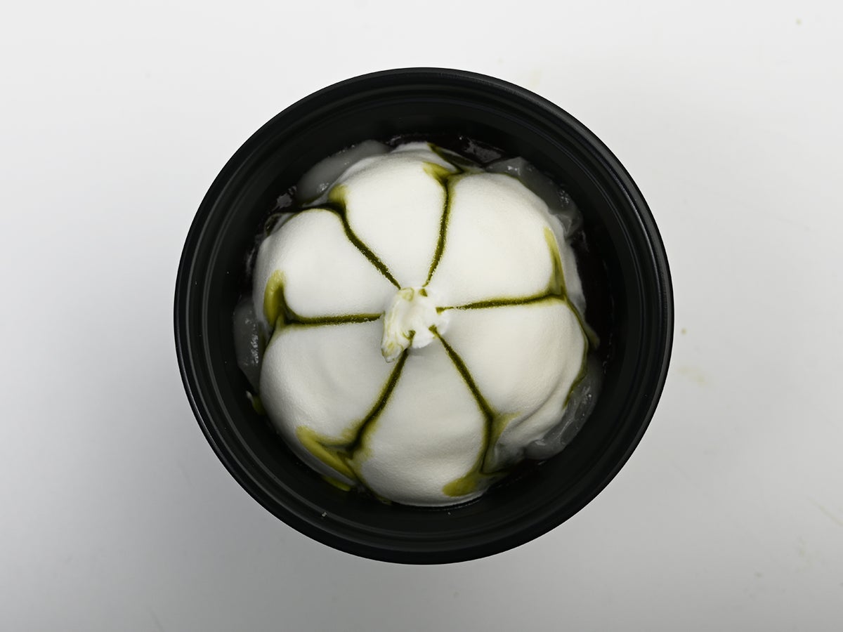 フタを開けると、ふわっと広がる抹茶の香り。そして目に飛び込んでくるのは、ドーム状にこんもりと盛り上がった真っ白なホイップ風アイス。表面には抹茶蜜が花びらのような筋を描いて流れ落ちていて、まるで和菓子のような美しさ。