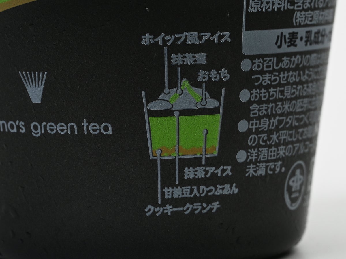 カップ側面には、上から「ホイップ風アイス/抹茶蜜/おもち/抹茶アイス/甘納豆入りつぶあん/クッキークランチ」と、6層の断面図がイラストで描かれているのも親切な作り。