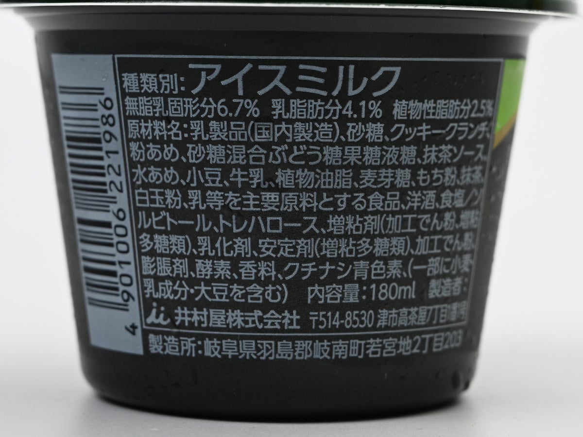 種類別はアイスミルク。無脂乳固形分6.7%、乳脂肪分4.1%、植物性脂肪分2.5%の配合で、ほどよい乳のコクを残しつつ、抹茶や和素材を主役に立てるバランス。内容量180mlに対して275kcalというのは、6素材の構成を考えると控えめな部類で、最後まですっきり食べきれる軽さに仕上がっています。