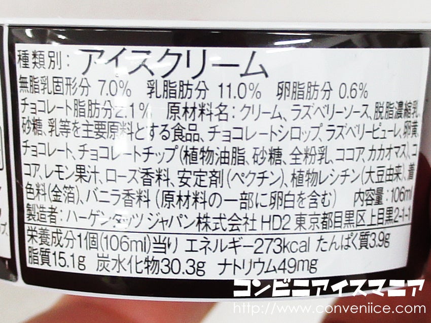 原材料には、クリーム、ラズベリーソース、チョコレートシロップ、ラズベリーピューレ、チョコチップ、レモン果汁、ローズ香料などが使われています。種別は(もちろん)アイスクリーム規格。1カップ(106ml)あたりのカロリーは273kcal。