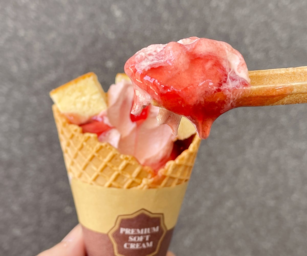 いちごソフトクリーム、いちごソース、そしてチーズケーキの濃厚さが融合し、贅沢な味を生み出しています。いちごソースのとろりとした食感は、甘酸っぱく濃厚で、ソフトクリームとの相性は抜群。