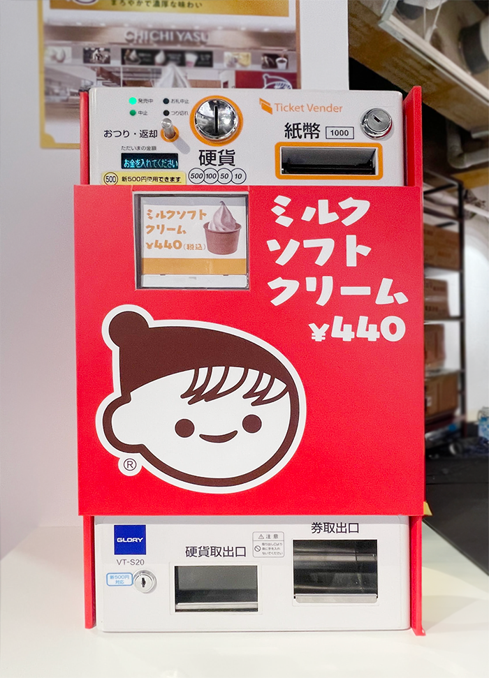 今回のお目当ては、広島県内にあるアンテナショップ「CHICHI YASU」で提供しており、今回広島県外で初めて登場するミルクソフトクリーム。まず、イベントスペース左手にある券売機でチケットを購入、受付に出して受け取ります。価格は440円。11:00から19:00までの提供しており、数量限定での販売です。