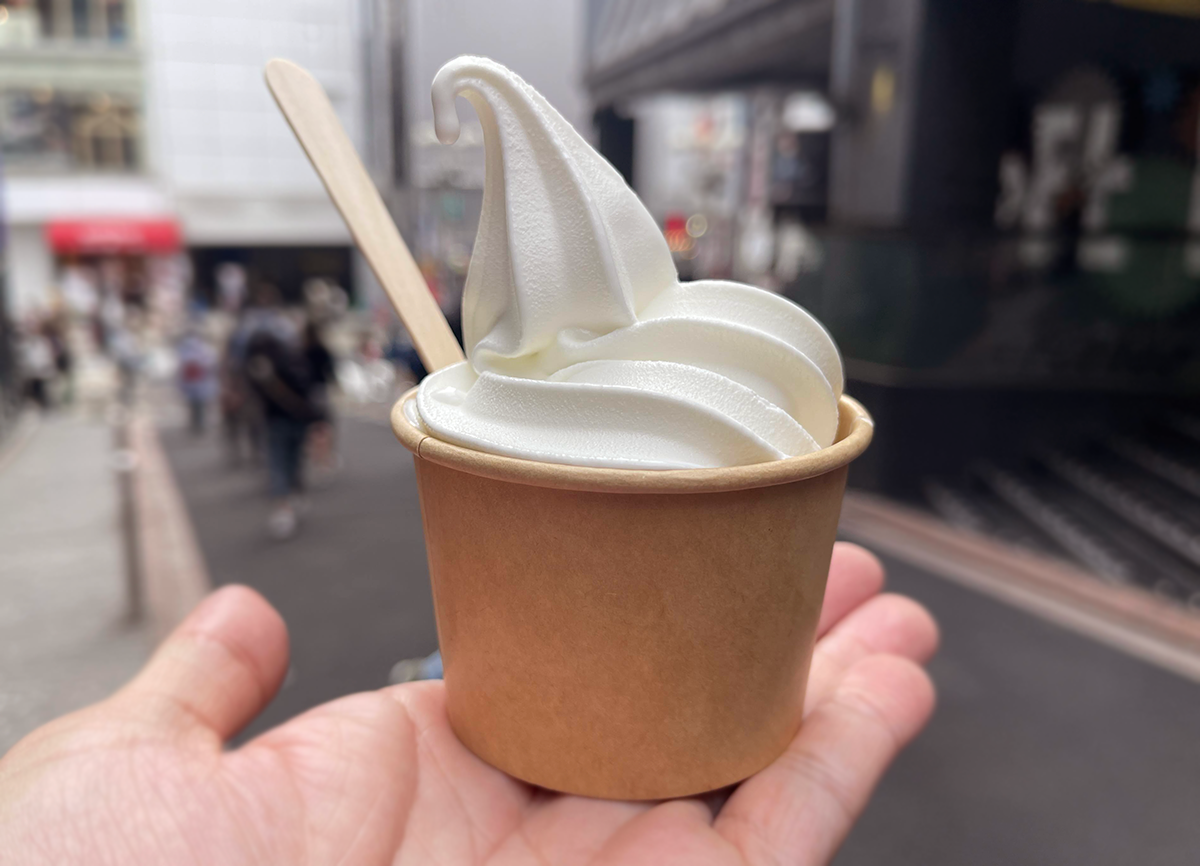 ソフトクリームは、渋谷ロフト店内でのご飲食はできないので外に出て食べます。とはいえ、購入してから20秒もあれば外に出られるので溶ける心配はありません。