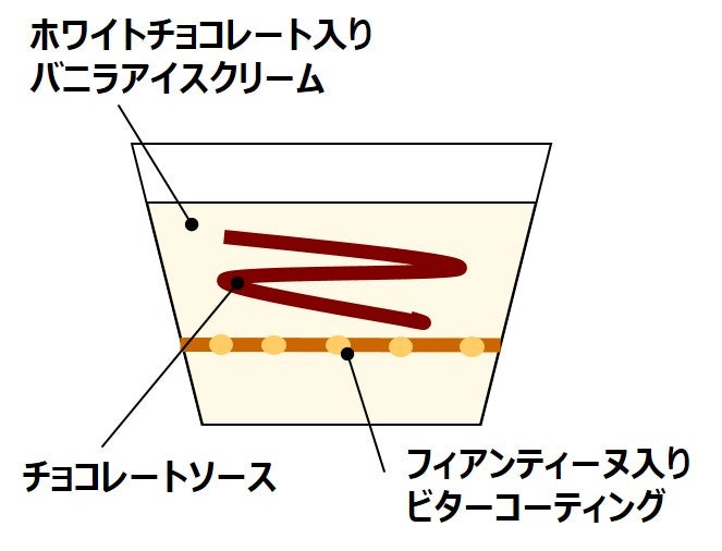 ホワイトチョコレートを加えたコク深いバニラアイスクリームと、とろりとしたほんのりビターなチョコレートソース、サクサクとした食感のフィアンティーヌ入りビターコーティングを層状に重ねました。食べ進めるにつれて、味わいと食感の変化が楽しめる。
