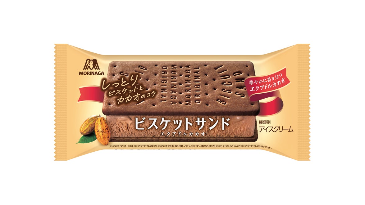 「ビスケットサンド」と同様にアイスクリーム規格にこだわった商品です。アイスクリーム部分には、華やかな香りが特長的なエクアドル産カカオ※を使用。また、ビスケット部分にはココアビスケットを採用。エクアドルカカオ味のアイスクリームの風味にマッチするように、2種類のココアを組み合わせたビスケットを使用し、「ビスケットサンド」の特長であるしっとりとしたビスケットはそのままに、カカオのコクがしっかりと感じられる品質に仕上がっている。